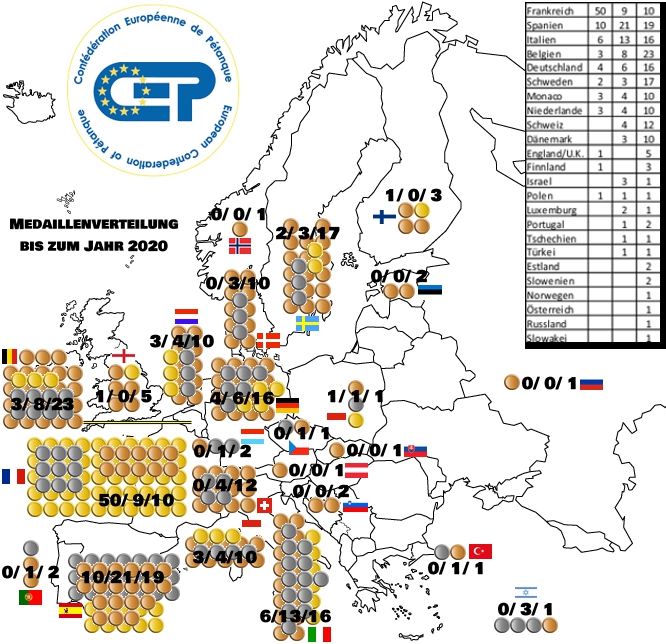 Die französischen Spitzenspieler/innen waren auf Europameisterschaften besonders erfolgreich, da sie bis 2020 alleine 50 Mal Europagold sammeln konnten und